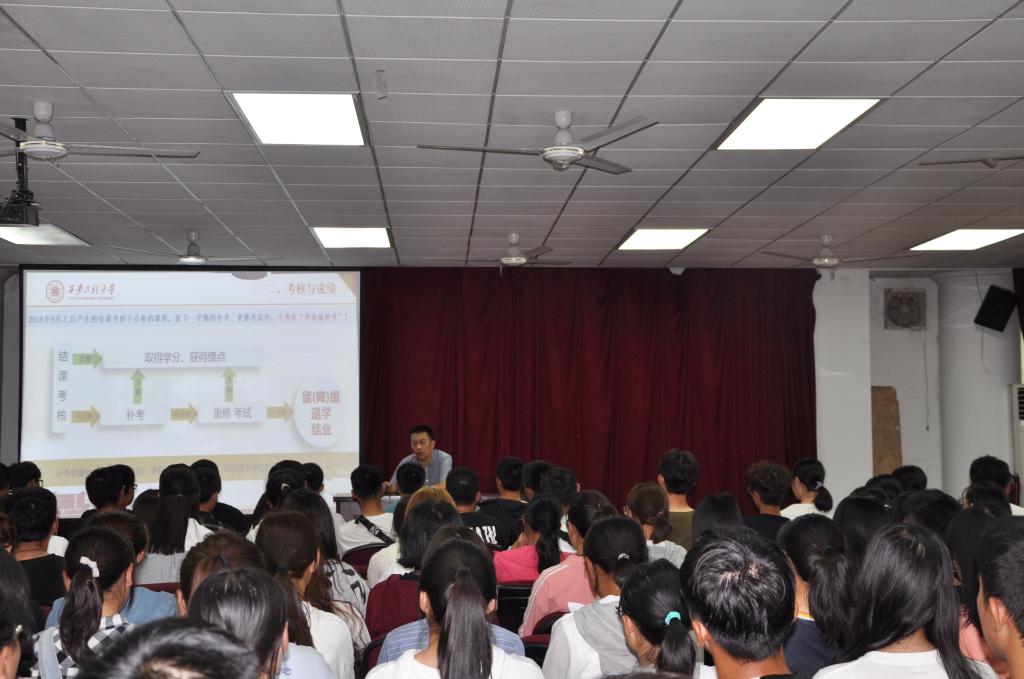 会上,教务科科长孟峰围绕入学与注册、考核成绩、学籍处理、转专业、培养方案、创新学分、授予学士学位、考试管理规定、推免生等问题做了一一说明。并结合实例,着重对学籍处理和授予学士学位等问题做了生动详尽的讲解。他强调,业精于勤而荒于嬉,行成于思而毁于随。大学四年,没有投机取巧,要脚踏实地听好每一堂课,完成每一门考试,坚决不能触碰作弊这调高压线。